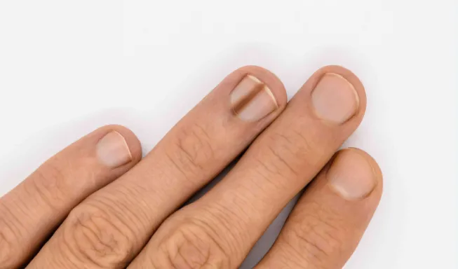 Horizontal ridges across the nails, known as Beau’s lines, may appear after severe illness, high fever, major stress, surgery, or chemotherapy.